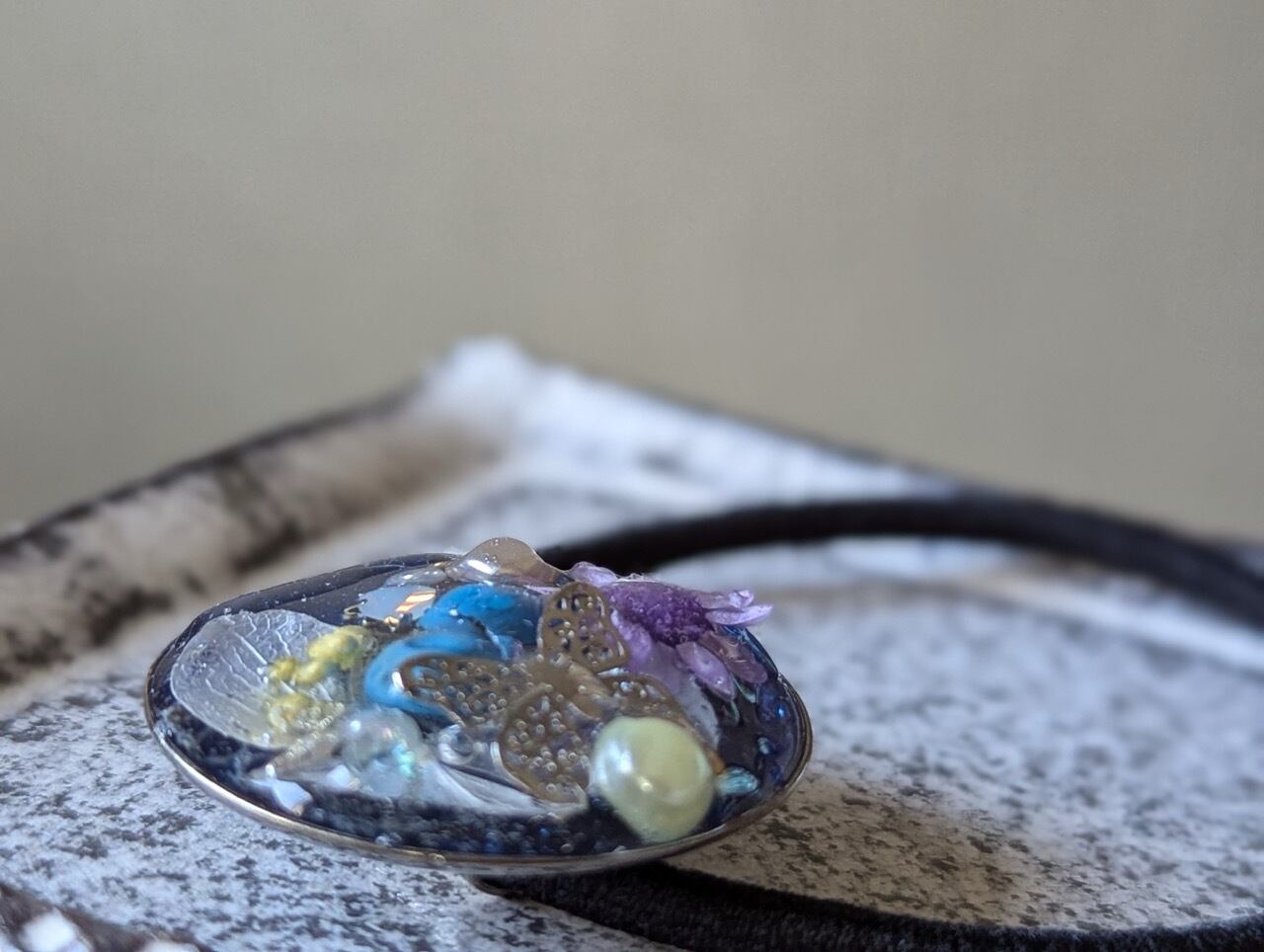 レジンをぷっくり盛って仕上げていますが、モチーフやドライフラワーの質感や存在感が際立つよう花びらなど若干繊細な部分があります。これくらいでカワイイ!と思うところまで、ぷっくりさせています。